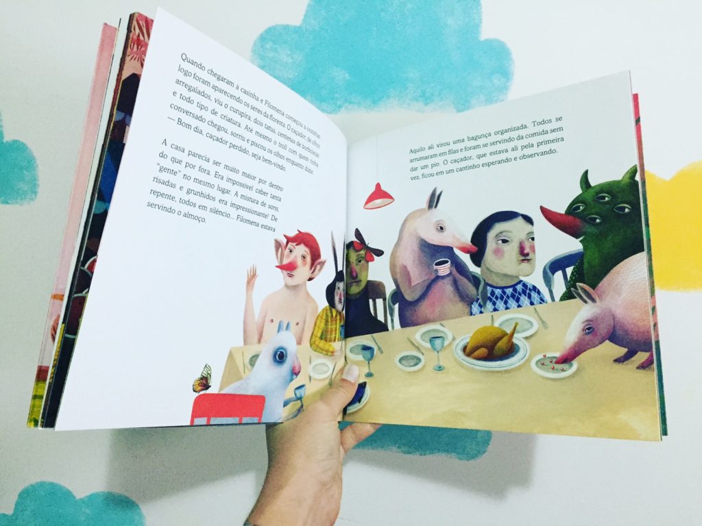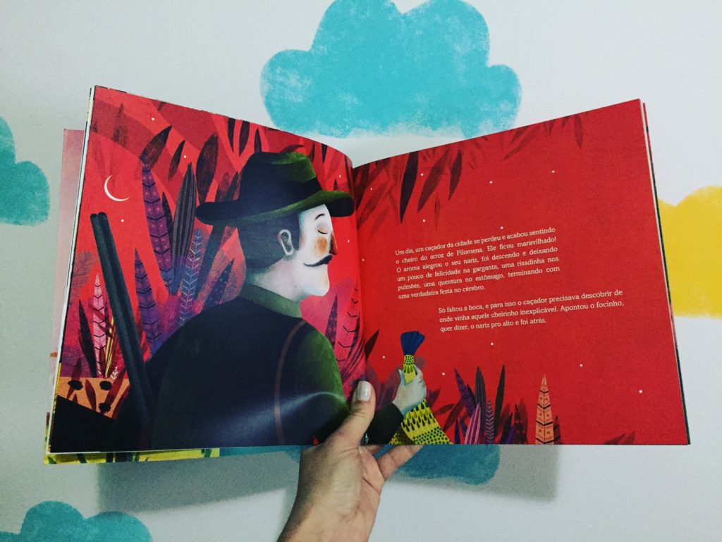 Ninguém queria saber da Filomena e ela vivia sozinha numa casa na floresta. Bem… sozinha não, ela estava sempre bem acompanhada dos mais fantásticos seres dali: trolls, sacis, lobisomens, ninfas e os animais que moravam pela região. Eles não se importavam com a aparência de Filomena e se deliciavam com suas especialidades: bolinho de bacalhau, bife à milanesa, musse de maracujá, tortas, pães, bolos… e, claro, o fantástico arroz!
